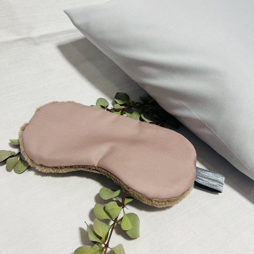 Jemná růžová barva tencelu v kombinaci s jemným mikroplyšem. Tak vypadá luxusní spací maska od TYKRÁSO. 100% Upcyklovaný kousek.